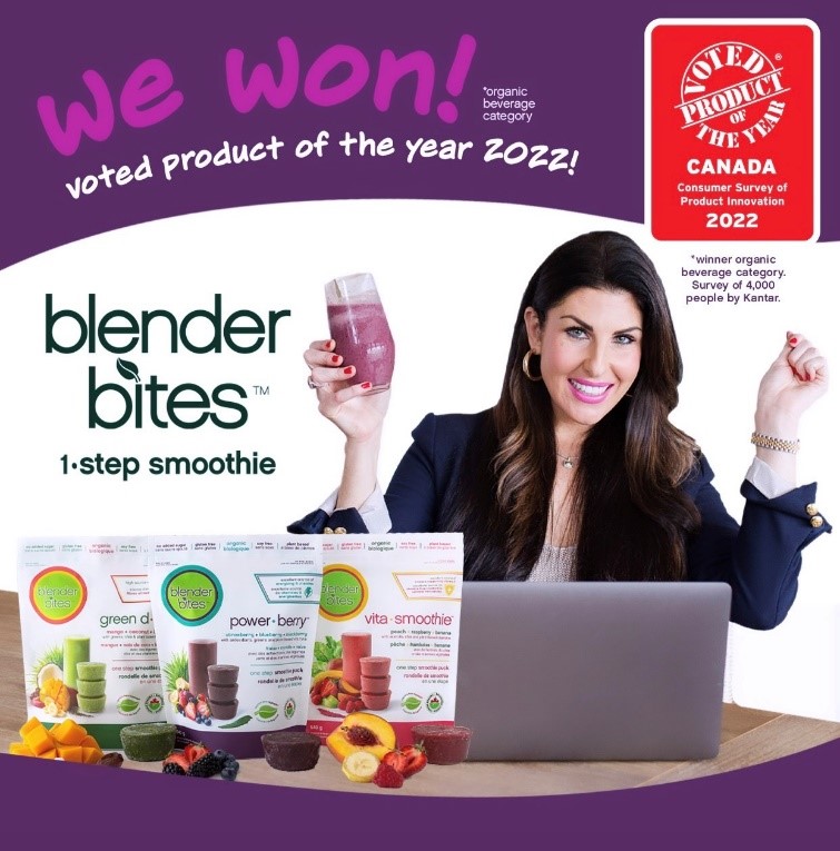 “Voted Product of the Year in the organic beverage category, by thousands of Canadian consumers comes at the most incredible time for the Company, as we branch out into international markets. This prestigious award is recognized in 40 countries and is a major stamp of approval for consumers and retailers looking to expand the innovation in their freezer category. We are incredibly humbled, grateful and thankful for the tremendous support shown by our customers and current Canadian grocery partners,” commented Chelsie Hodge, Blender Bites CEO.