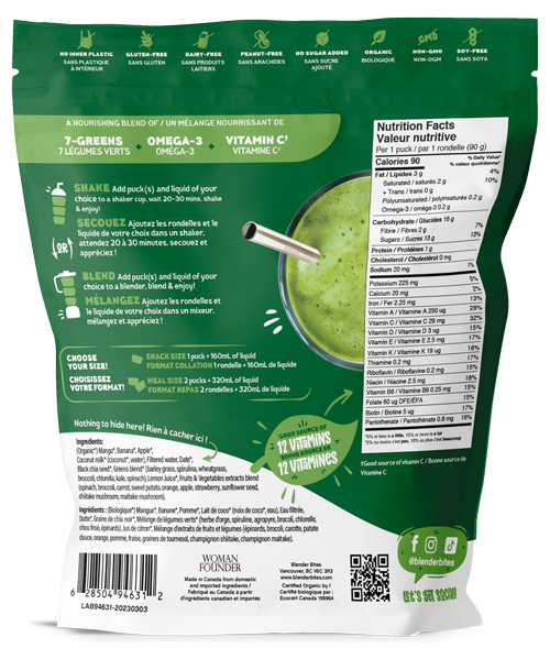 Ingredients: Mango*, Banana*, Apple*, Coconut milk* (coconut*, water), Filtered water, Date*, Black chia seed*, Greens blend* (barley grass, spirulina, wheatgrass, broccoli, chlorella, kale, spinach), Lemon Juice*, Fruits & Vegetables extracts blend (spinach, broccoli, carrot, sweet potato, orange, apple, strawberry, sunflower seed, shiitake mushroom, maitake mushroom).