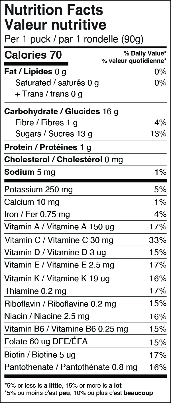 Ingredients: Peach*, Banana*, Apple*, Strawberry*, Raspberry*, Black chia seed*, Acerola powder*, Fruits & Vegetables extracts blend (spinach, broccoli, carrot, sweet potato, orange, apple, strawberry, sunflower seed, shiitake mushroom, maitake mushroom), Beet powder*, Natural flavours*.