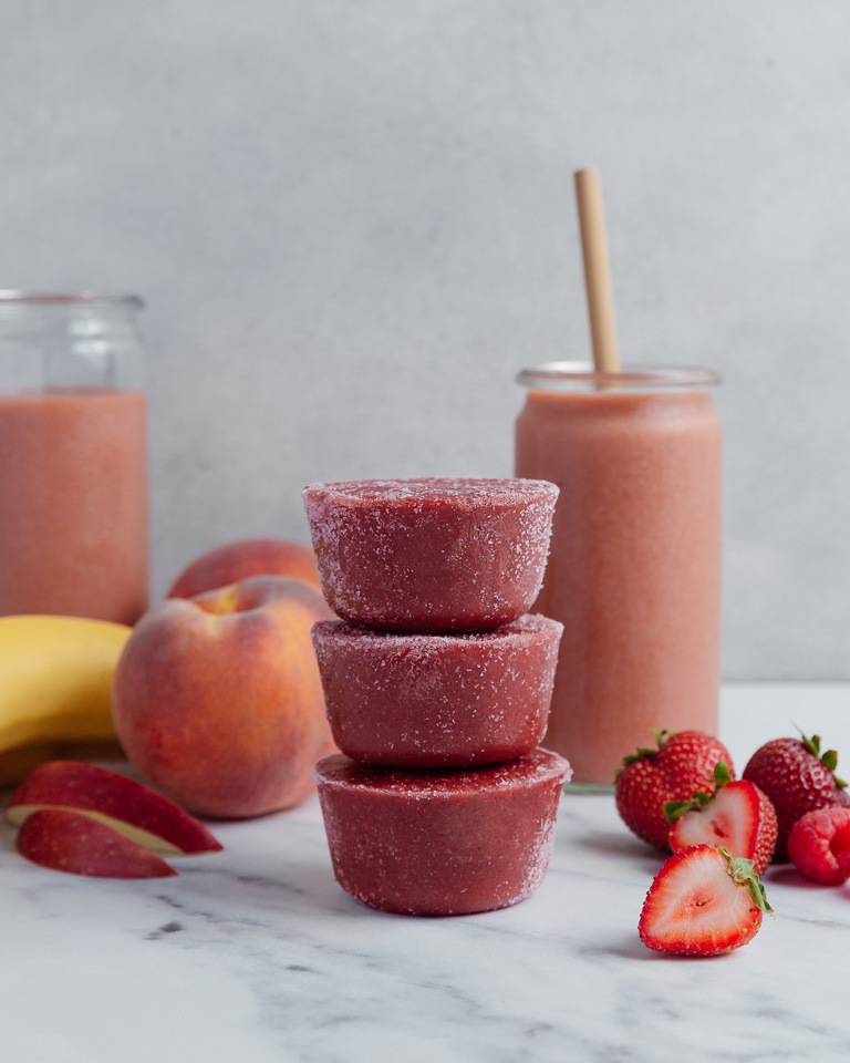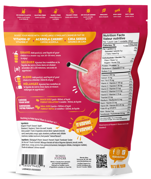 Ingredients: Peach*, Banana*, Apple*, Strawberry*, Raspberry*, Black chia seed*, Acerola powder*, Fruits & Vegetables extracts blend (spinach, broccoli, carrot, sweet potato, orange, apple, strawberry, sunflower seed, shiitake mushroom, maitake mushroom), Beet powder*, Natural flavours*.