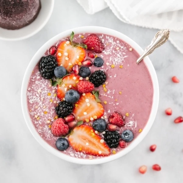 Ingredients: Strawberry*, Cherry*, Apple*, Banana*, Blueberry*, Date*, Filtered water, Lemon juice*, Greens blend* (barley grass, spirulina, wheatgrass, broccoli, chlorella, kale, spinach), Natural flavors*, Plant based vitamins and minerals derived from (spinach, broccoli, carrot, sweet potato, orange, apple, strawberry, sunflower seed, shiitake mushroom, maitake mushroom), Acerola powder*.